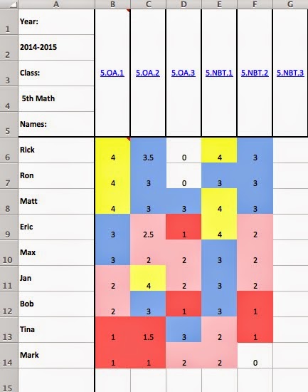 My first attempt to create a tracking sheet for the scales was very old-school. I made a simple chart in a word doc. This summer I upgraded the word docs to color-coded excel spreadsheets with links to the common core standard descriptions for quick reference. Now they look like this…you can use the sorting function to group your students for differentiation.