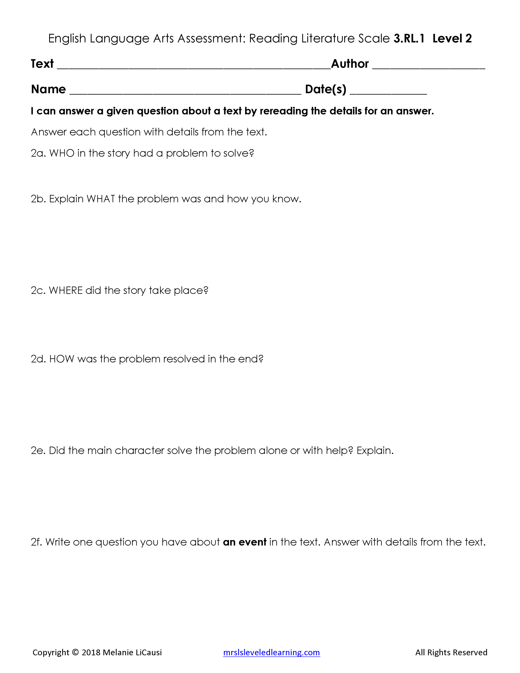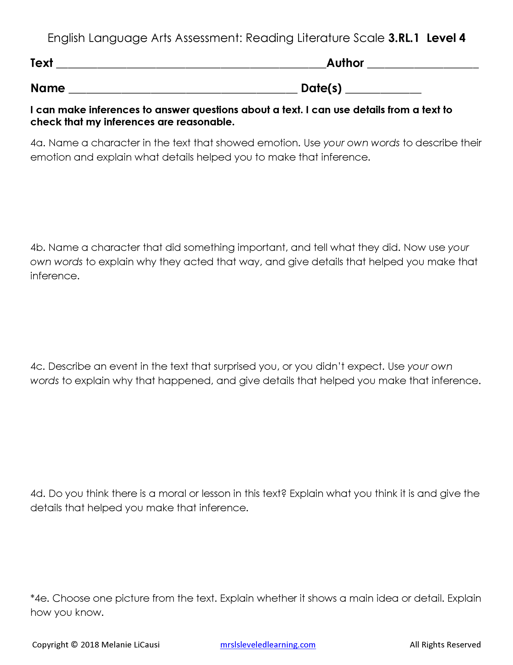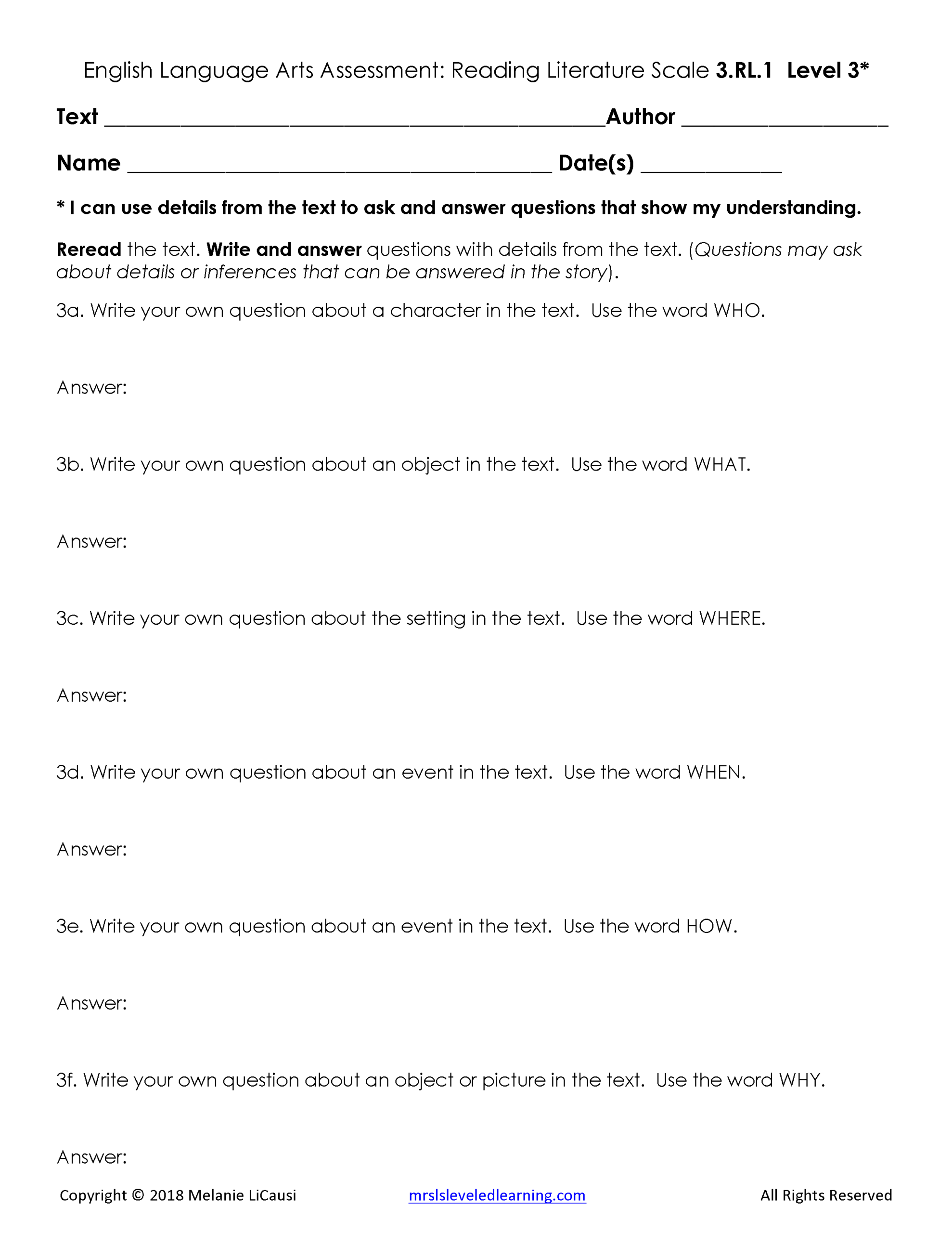 2. Assessments for every Language Arts standard that includes 4 levels of questions and answer keys.