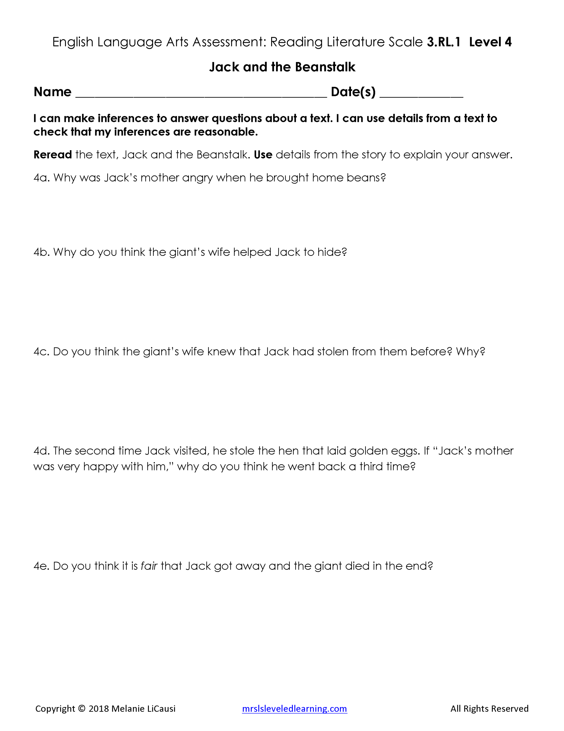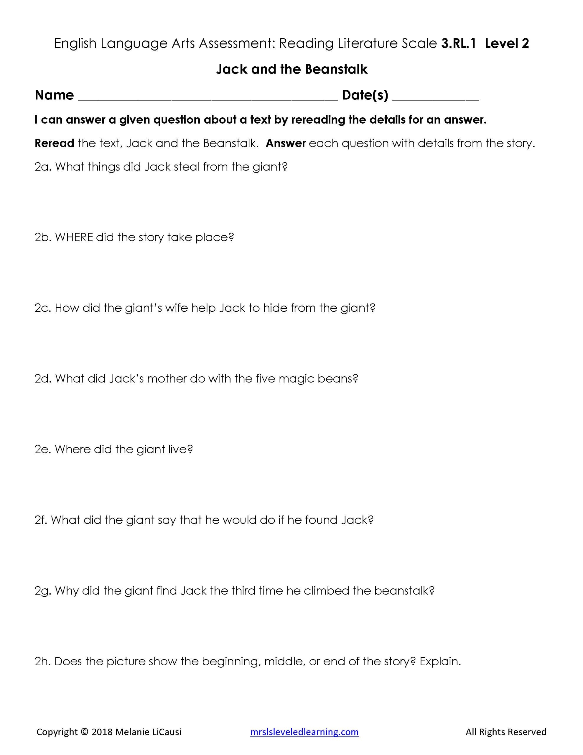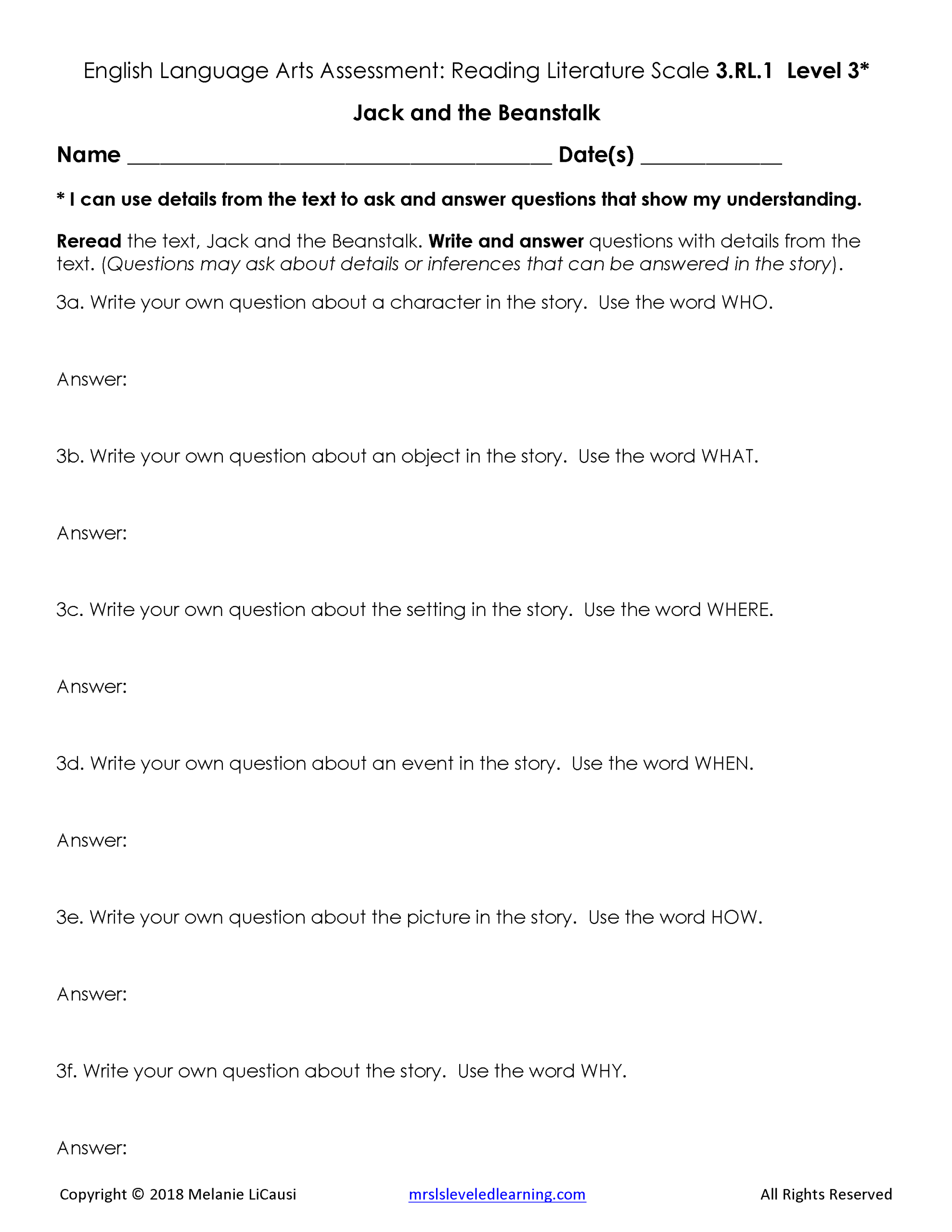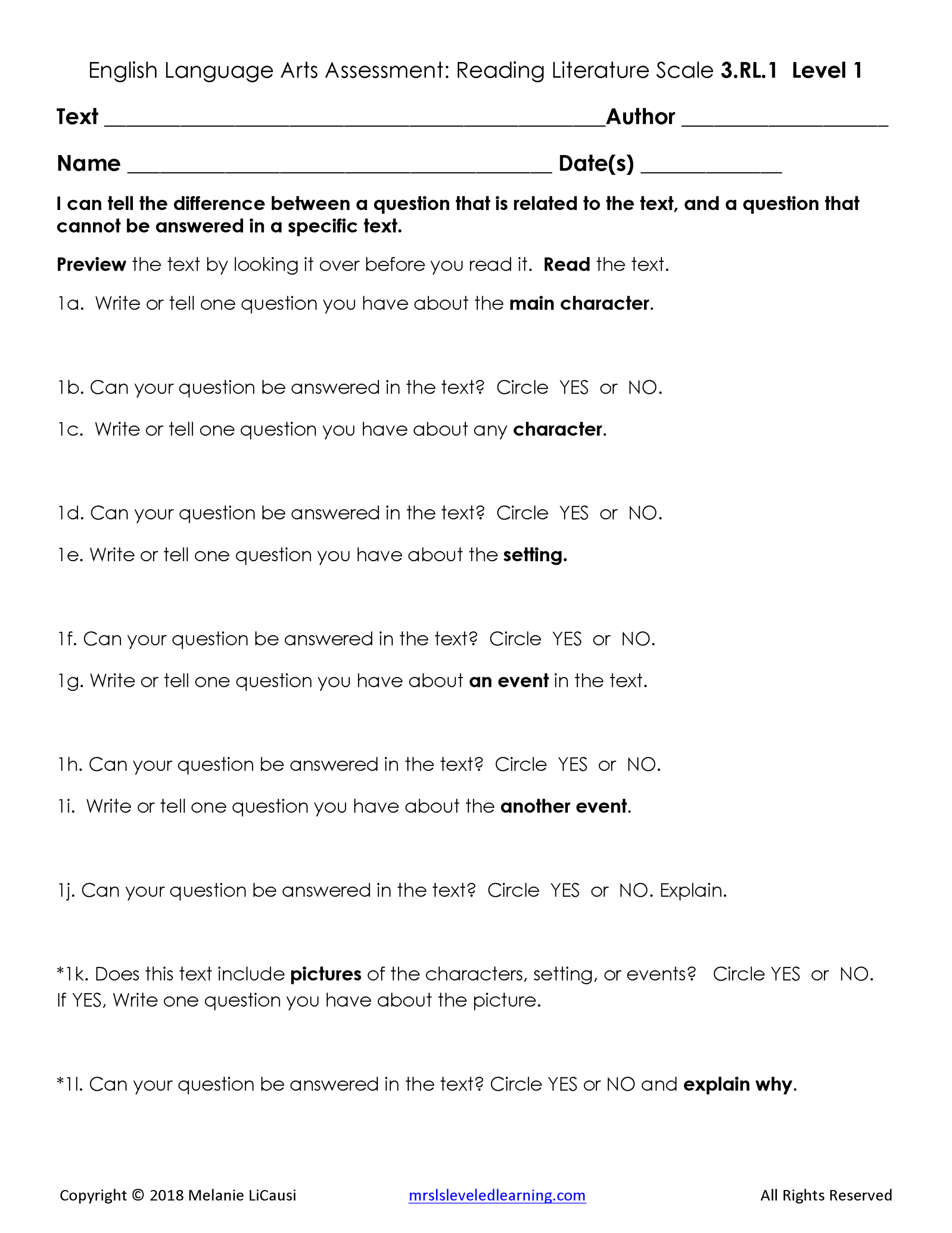 2. Assessments for every Language Arts standard that includes 4 levels of questions and answer keys.
