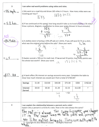 Subskills c. and d. are addressed in Scales 3 and 4 of this assessment. In problem 3d) the student correctly calculated an additional time of 176 miles. You might notice that the published version has been revised so students solve for 176 miles total, instead of 165 + 176 miles. Problem 3e) was miscalculated because his work shows that he was trying to find out how many times 15 went into 100%, but it doesn’t work out evenly, so his strategy got him close, but not to the accurate answer of $25. My strategy with this student is to review strategies for checking his work with percents; working backwards, or using equivalent fractions to check that the part to whole ratio of the percents match his solution. For instance, if he had compared 15/100 to $3.75/$24, he would see that $3.75 x 4 makes 15, but 24 x 4 does not make 100! Since this is the only problem that was incorrect in Scale 3, and he gave a decent answer for Scale 4, I am confident that he has mastered this standard, but still needs some follow up as far as checking his work.