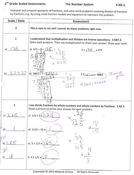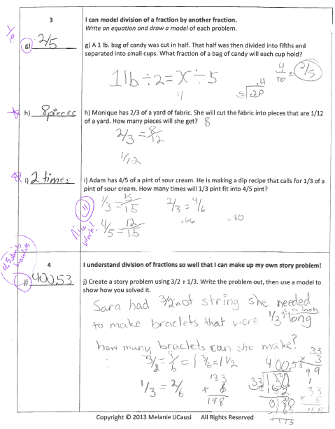 To create the Scale 1 and 2 for this standard, I cited 4.NBT.6 and 5.NF.7 as previous standards that students can connect to dividing fractions. The first idea is that multiplication and division are inverse operations that can be used to check each other. This is helpful when students are just starting to understand division and fractions and may be tempted to guess answers because they can’t visualize what’s going on. Scale 2 reminds students to reflect on the meaning of multiplication and division of fractions by whole numbers. The directions specifically ask students to “draw a picture” of each problem because the standard also emphasizes using visual models. This student tried to convert the fractions to decimals instead, and wasn’t able to see that she was making mistakes. If she had drawn a picture of 1/4 of a whole, then divided that into 5 equal pieces, she would have easily recognized that 20 pieces would fit into 1 whole = 1/20.