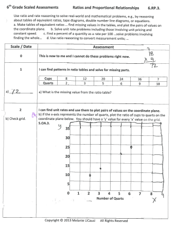 Are you working with Standards-Based Grading, Performance Scales, or a Growth Mindset?  Trying to figure out how to assess them? This page includes various student work samples with Marzano Scales from my 4th, 5th, and 6th Grade Math Leveled Assessments. These assessments were specifically designed to document student mastery at each level. Students get clear visual feedback about their performance and you get documentation, insights into planning, an outline for differentiation, and a handy two-suede page that works as a pretest and posttest.