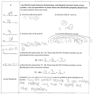 Here students are asked to use skills they have from 5th grade (multiples, factors, and distributive property) in specific ways. This student undoubtedly shows mastery of this standard. I chose this one as an example of a good explanation for question 3p).