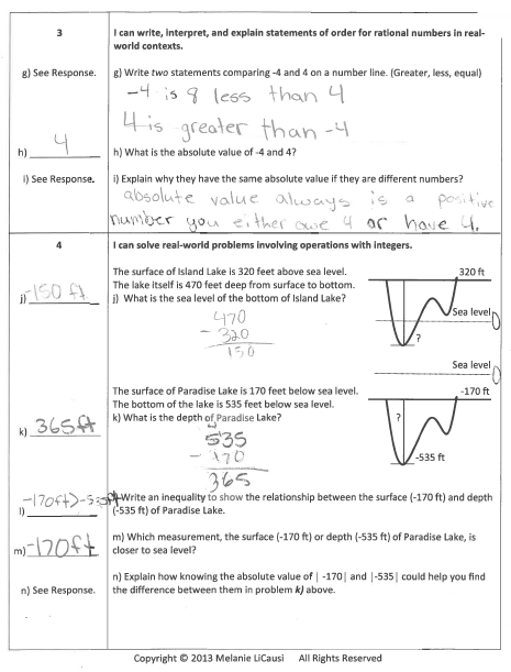 In 6.NS.6, students are asked to apply an understanding of negative integers to coordinate grids. In 6.NS.7, they must apply it to new contexts such as story problems. Students need to be able to identify the context for positive, negative, and absolute values, but aren’t required to solve operations yet. That is why Scale 4, shows tasks above grade level: computation with integers. This student shows mastery of the standard, and the ability to apply this understanding to adding and subtracting integers. The diagrams of sea level help them to visualize the position of the integers, like a number line would. An extension to these tasks might be asking students to draw their own diagram based on a story problem, then check to see if they interpreted the position of the numbers correctly.